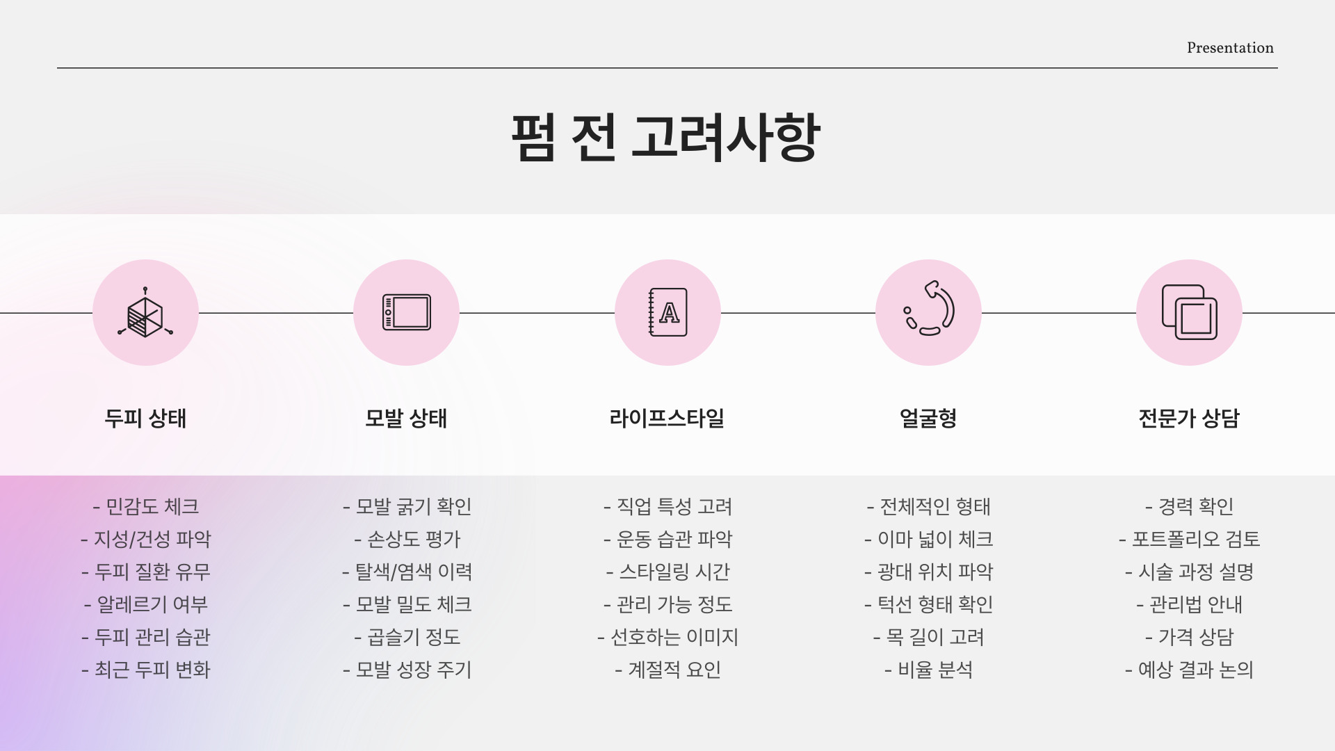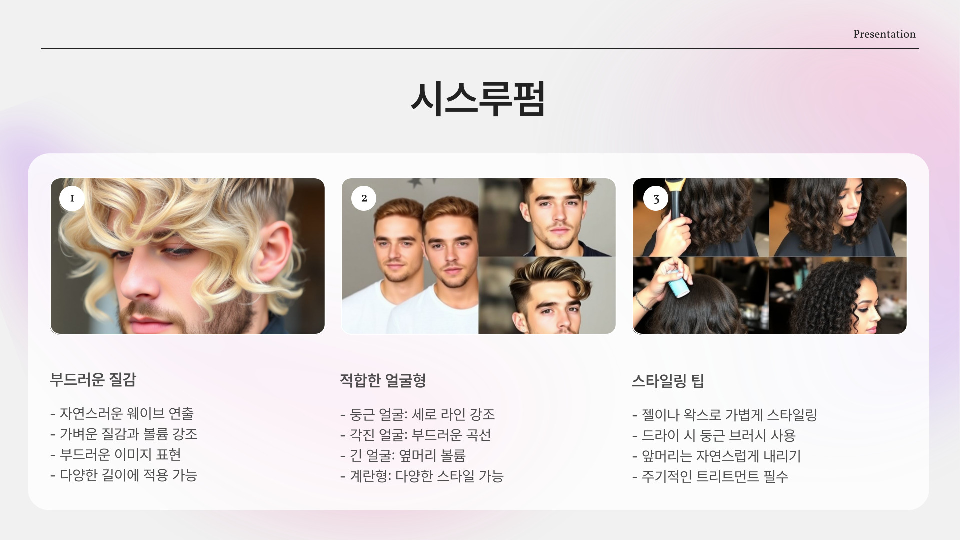 - 모발 상태, 얼굴형, 라이프스타일 고려하여 스타일 선택
