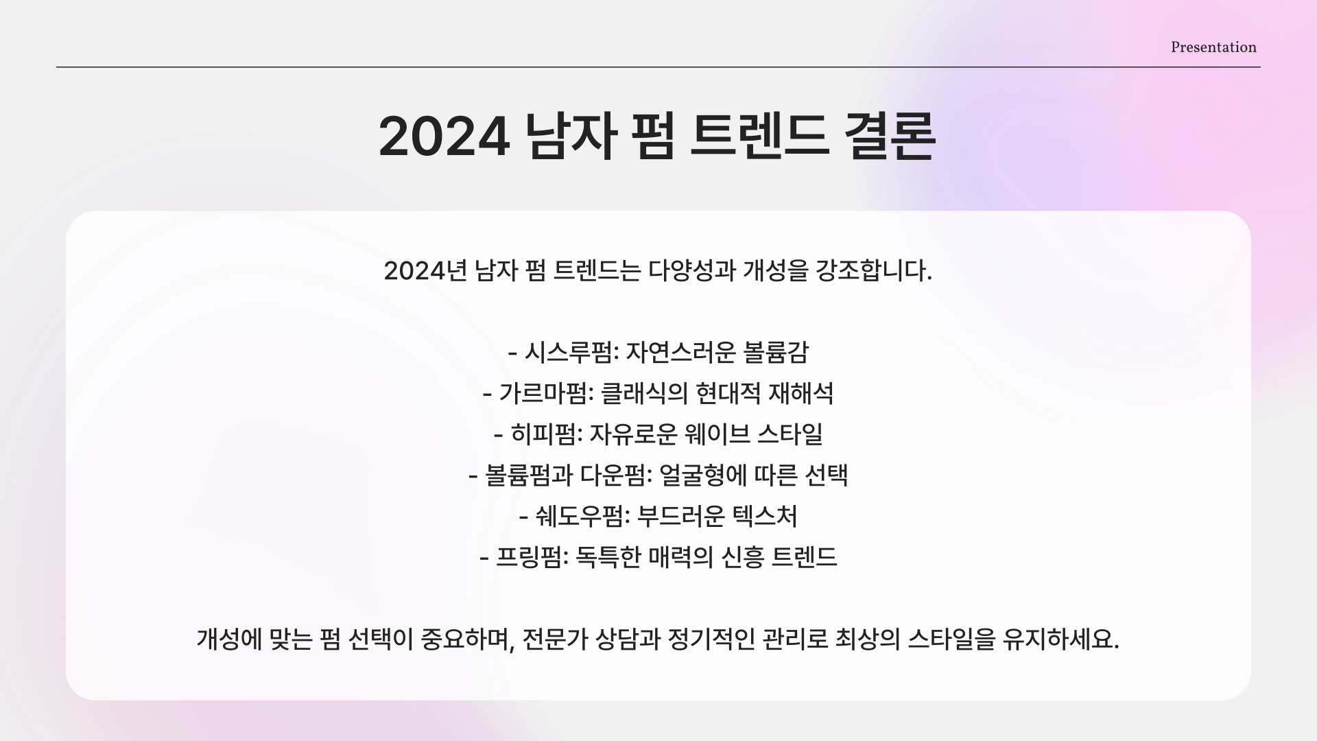 2024년 남자 펌 스타일은 다양하고 개성 넘치는 선택지가 많습니다. 자신의 모발 상태와 얼굴형, 라이프스타일을 고려하여 적절한 스타일을 선택하고, 올바른 관리 방법을 통해 건강한 모발을 유지하는 것이 중요합니다.