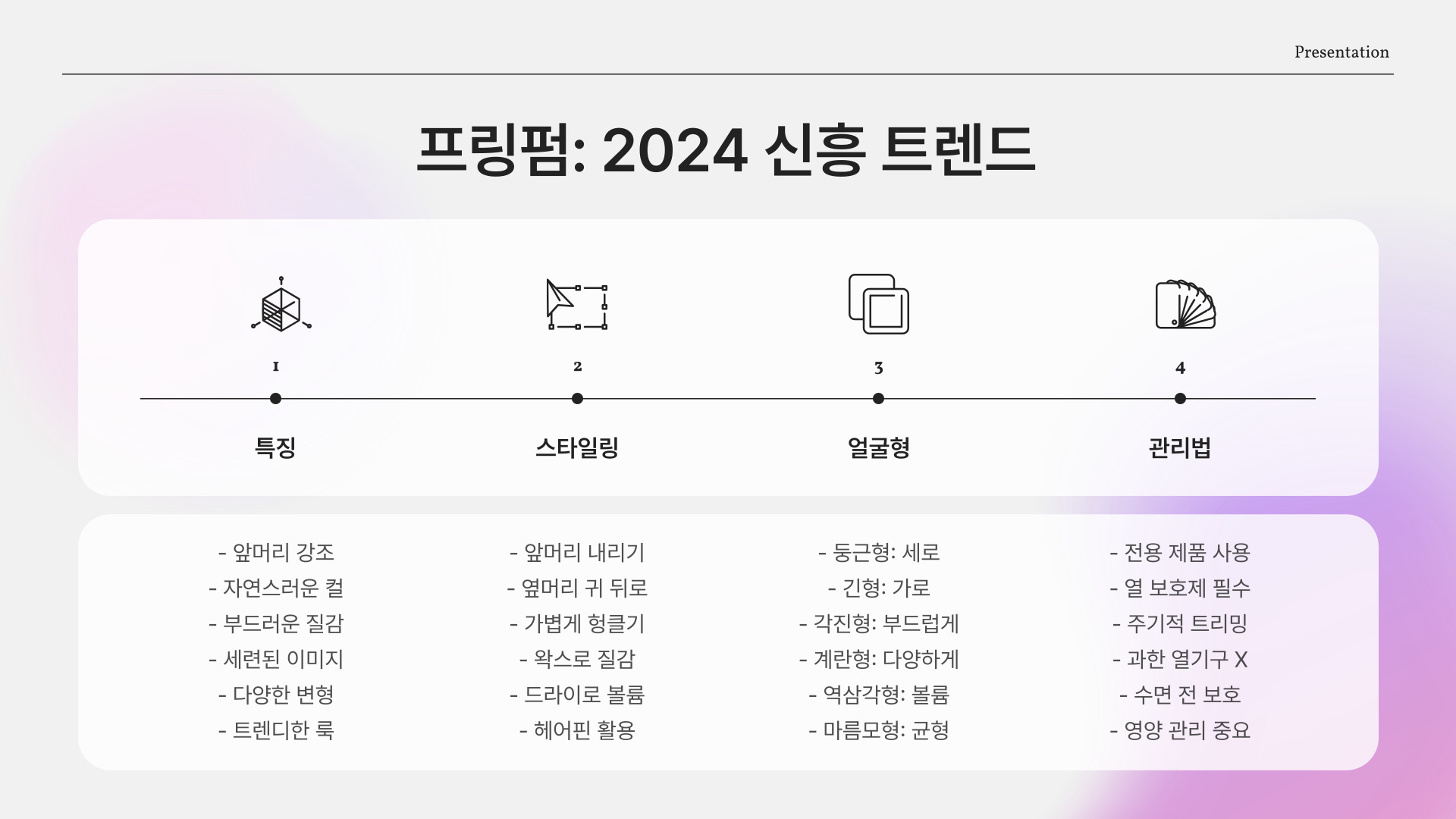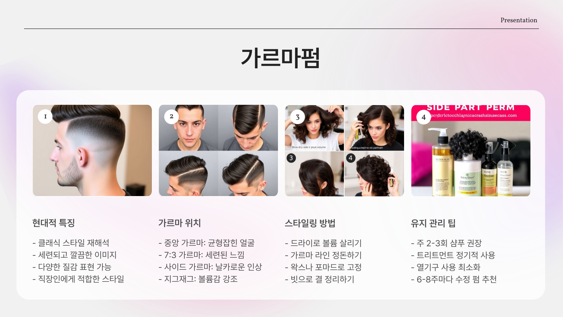 - 모발 상태, 얼굴형, 라이프스타일 고려하여 스타일 선택