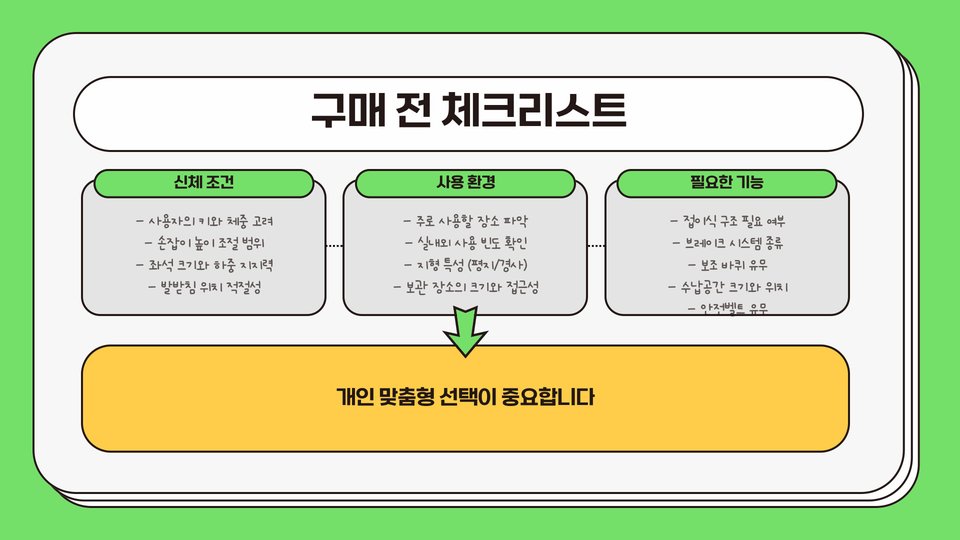 - 구매 시 안전성, 편안함, 접이식 여부를 고려해야 합니다.
