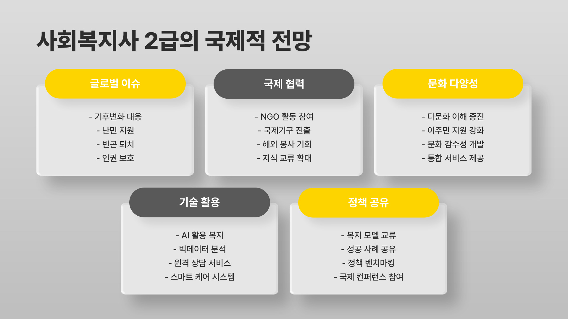 - 정부의 정책 변화는 사회복지사 2급의 활동 영역을 넓힌다.