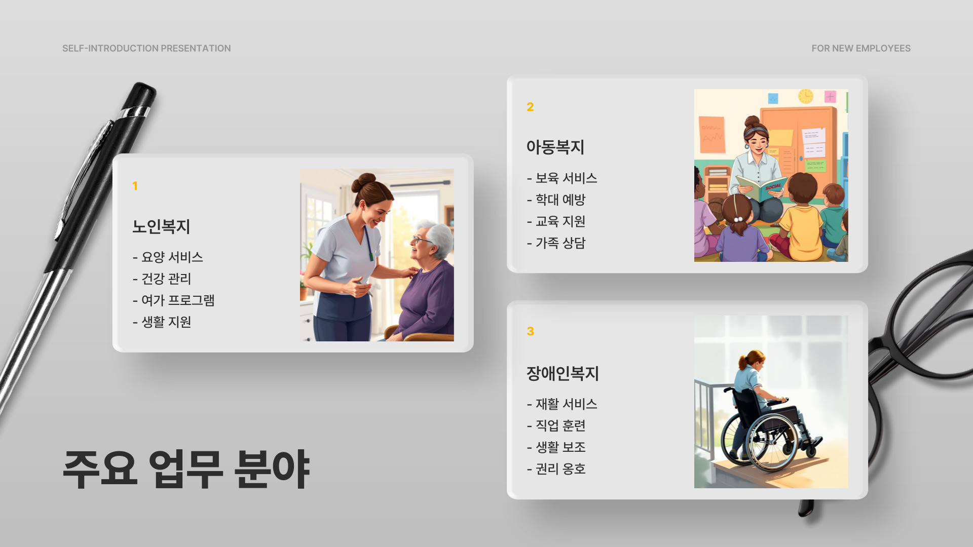 - 복지 서비스의 질적 향상을 위해 계속적 교육과 연구가 필요하다.