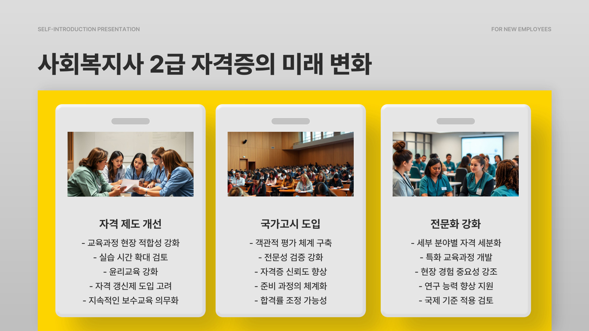 자격증 취득 후에는 계속해서 전문성을 높이기 위해 정기적인 교육과 세미나에 참여하는 것이 좋습니다. 이는 사회복지사로서의 역량을 강화하고, 변화하는 사회복지 환경에 적응하는 데 큰 도움이 됩니다.