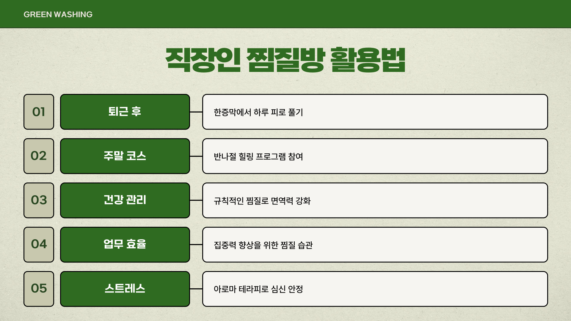 2025년 서울에서 추천하는 찜질방 TOP 5를 소개해 드렸습니다. 이곳들은 모두 편안함과 즐거움을 제공하며, 특별한 힐링 경험을 선사합니다. 찜질방에서의 소중한 시간을 통해 몸과 마음의 피로를 풀어보세요!