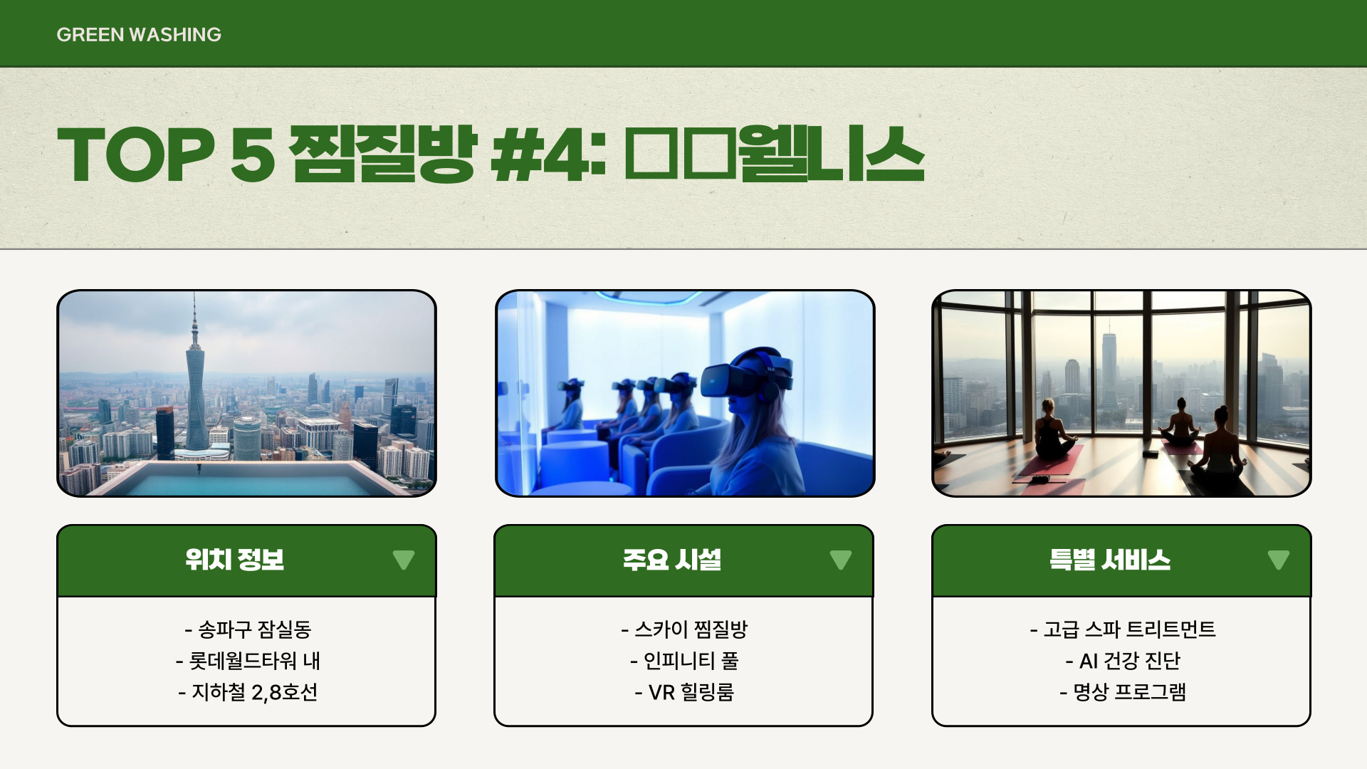 - 송파 파크하비오: 찜질방과 워터파크 결합, 가족 단위 방문객에 적합