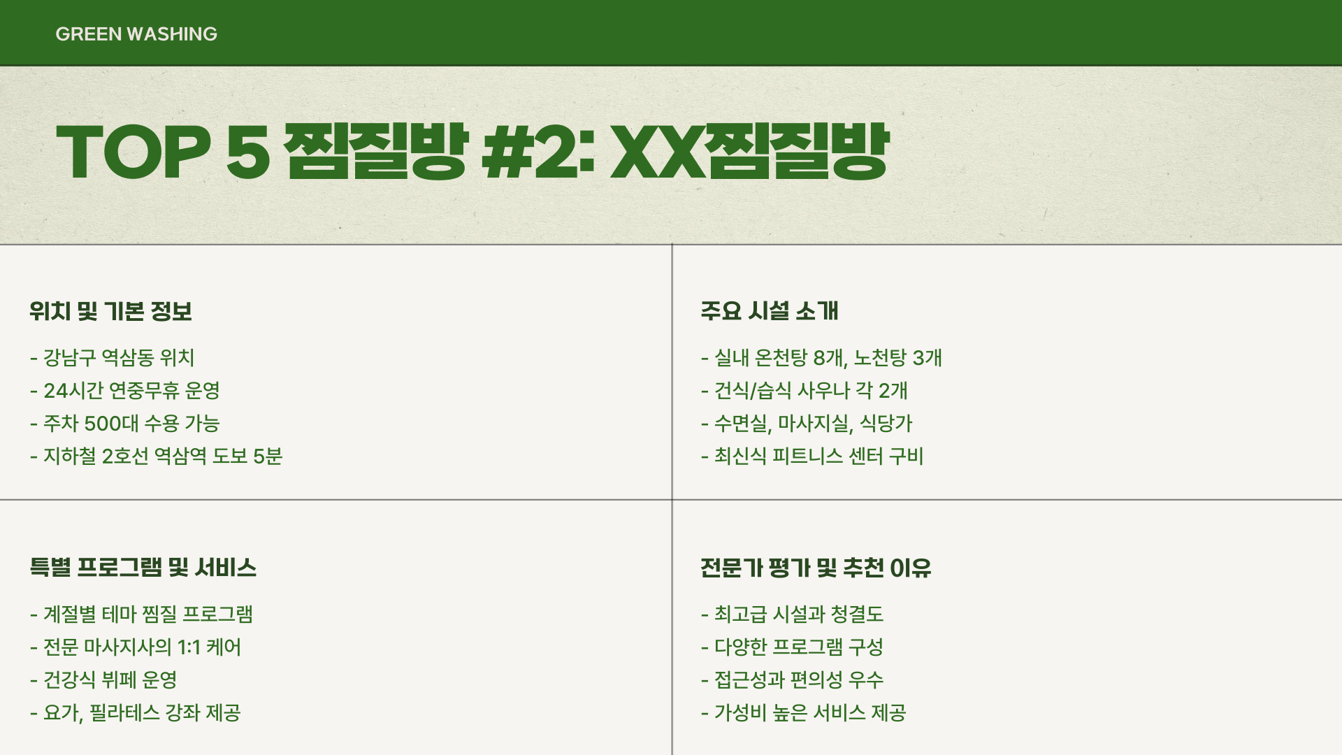 두 번째로 추천하는 숲속 한방랜드는 한방 찜질을 통해 건강을 중시하는 분들에게 특히 추천합니다. 이곳은 자연 친화적인 인테리어와 함께 다양한 한방 재료를 사용하여 몸과 마음을 치유하는 공간으로 알려져 있습니다. 또한, 다양한 한방 찜질방과 아로마 치료실이 있어 힐링을 원하는 모든 분들에게 안성맞춤입니다.