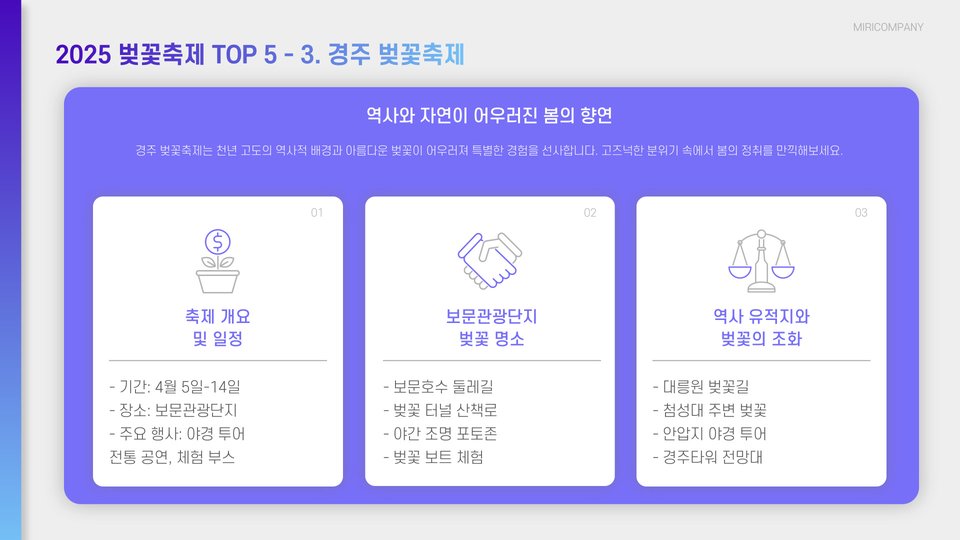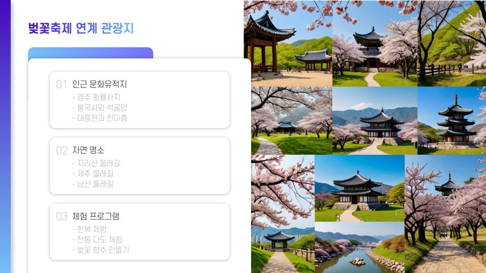 경주 벚꽃축제는 역사적인 경주에서 열리는 축제로, 벚꽃과 함께 문화유산을 경험할 수 있는 특별한 기회입니다. 이 축제는 벚꽃을 감상하며 다양한 문화 행사와 전통 공연을 즐길 수 있는 장을 제공합니다. 특히, 경주에서의 벚꽃은 고대 유적과 어우러져 더욱 아름답습니다.