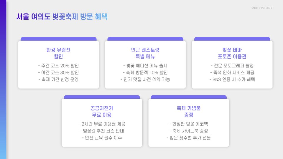 여의도 봄꽃축제는 서울에서 열리는 가장 유명한 벚꽃축제 중 하나입니다. 이곳에서는 화려한 벚꽃과 함께 다양한 먹거리, 공연을 즐길 수 있습니다. 특히, 여의도의 벚꽃은 한강과 어우러져 매우 아름답습니다. 이 축제의 혜택으로는 다양한 문화 이벤트와 무료 공연이 포함되어 있습니다.