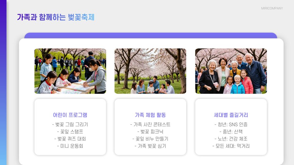 서울숲 벚꽃축제는 가족 단위 관람객을 위해 다양한 프로그램을 제공합니다. 어린이 체험 프로그램과 다양한 놀이터가 마련되어 있어 아이들과 함께 즐기기 좋은 장소입니다. 또한, 서울숲의 자연과 벚꽃은 도시 생활에서 벗어나 힐링할 수 있는 기회를 제공합니다.