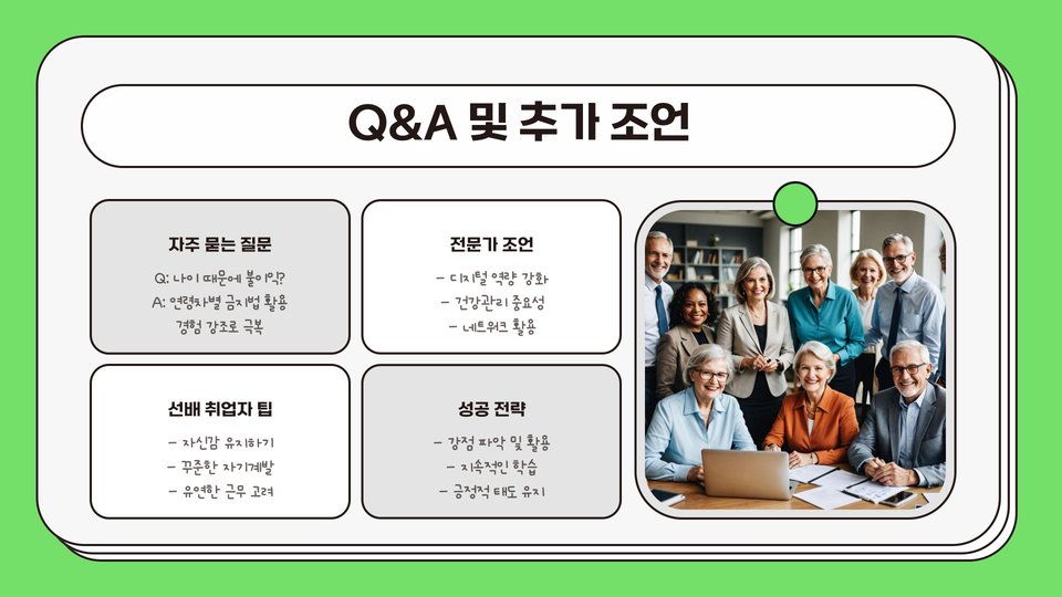 마지막으로, 자신의 경력에 대한 긍정적인 인식이 중요합니다. 나이가 들어도 여전히 많은 경험을 가지고 있다는 점을 자각하는 것이 필요합니다. 그 경험은 때로는 젊은 세대보다 더 큰 가치가 있을 수 있습니다. 따라서 언제나 긍정적인 마음가짐을 유지하며 새로운 도전에 나서는 것이 중요합니다.