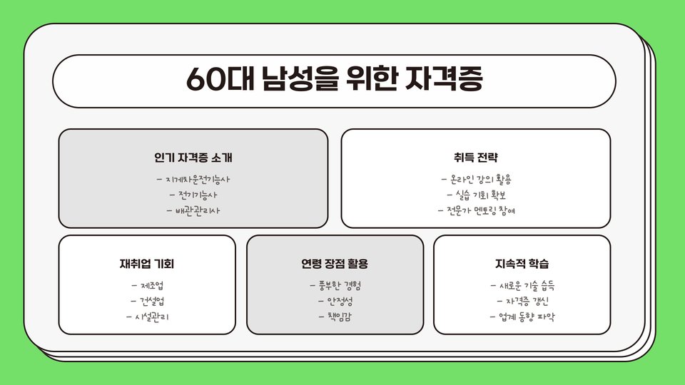 60대에 일자리를 찾는 것은 결코 쉽지 않은 과정이지만, 자격증 취득과 체계적인 준비를 통해 충분히 가능성을 높일 수 있습니다. 중요한 것은 긍정적인 자세와 지속적인 노력입니다. 이를 바탕으로 새로운 도전에 나선다면, 원하는 일자리를 찾을 수 있을 것입니다.