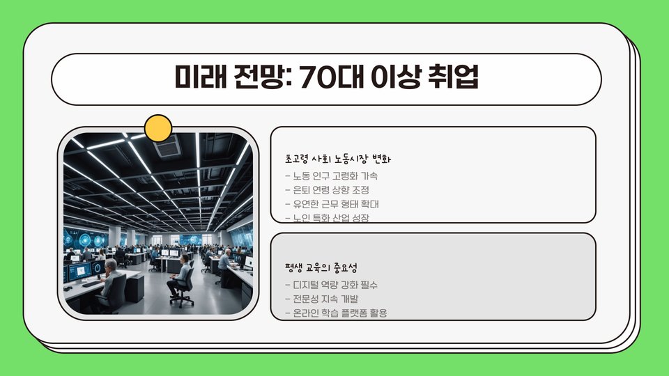 결론적으로, 60대는 새로운 일자리를 찾기에 결코 늦지 않은 시점입니다. 자격증을 통한 전문성 향상, 디지털 기술 습득, 인맥 구축 외에도 경력을 긍정적으로 바라보고 다양한 도전에 나설 수 있는 힘이 중요합니다. 현재 여러 가능성이 여러분을 기다리고 있으니, 주저하지 말고 새로운 여정을 시작해 보시길 바랍니다.
