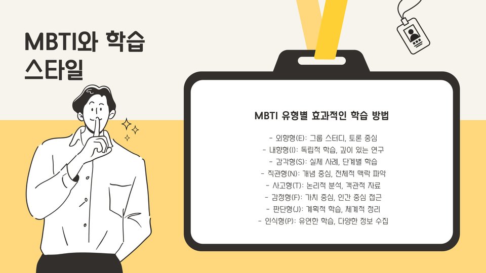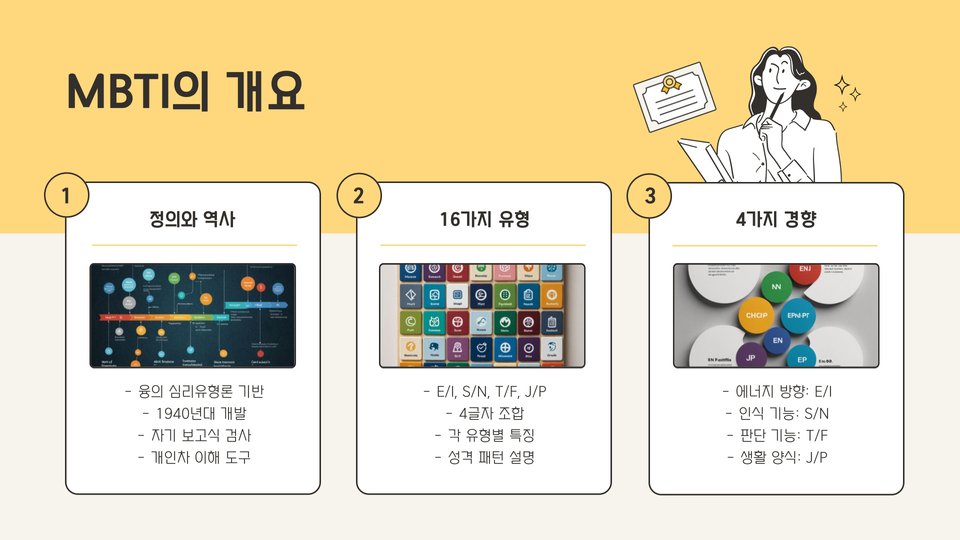 • MBTI 검사는 16가지 성격 유형으로 개인의 성격을 분류합니다.