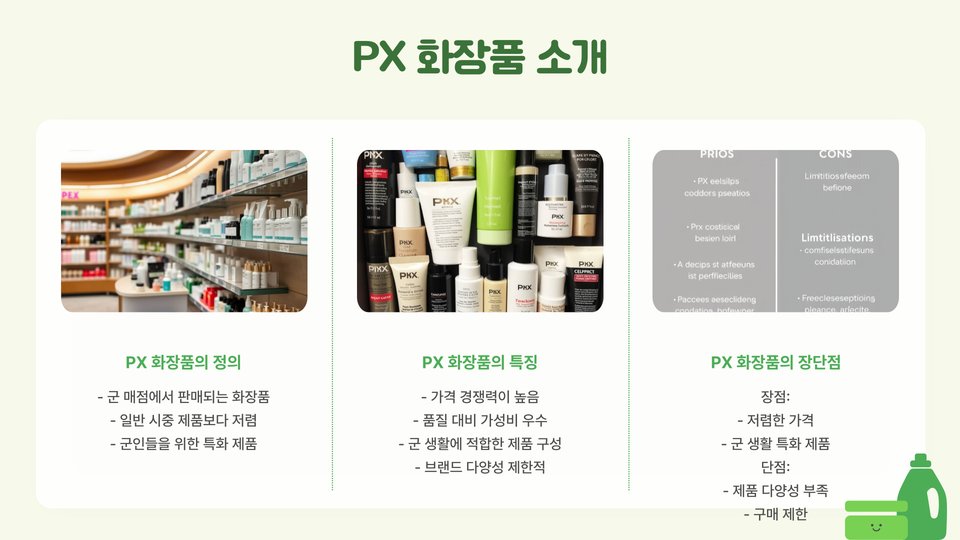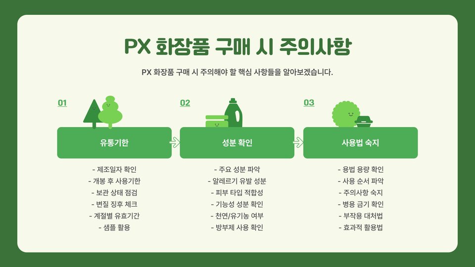 우선 px 화장품의 장점에 대해 살펴보겠습니다. 첫 번째로, px 화장품은 고품질의 원료를 사용하여 생산됩니다. 이는 피부에 부드럽고 자극이 적은 제품으로, 민감한 피부를 가진 사람들에게도 적합합니다. 예를 들어, px의 수분 크림을 사용하면 보습 효과가 탁월하여, 사용 후 피부가 한층 더 부드러워지는 것을 느낄 수 있습니다.