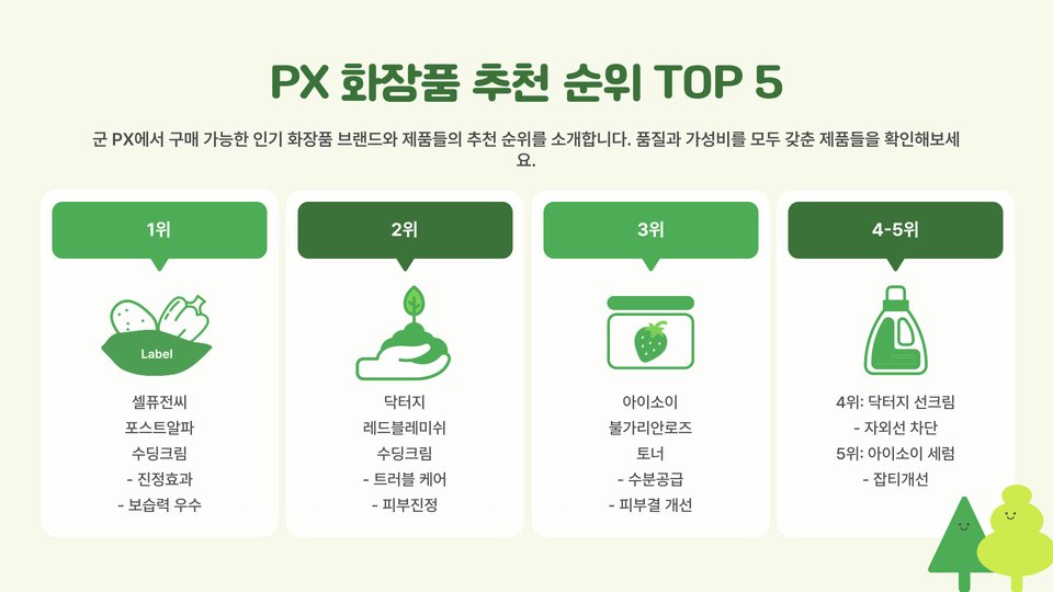 - 1위: px 화장품 - 뛰어난 품질과 경제적인 가격, 제품 다양성으로 인기를 끌고 있습니다.