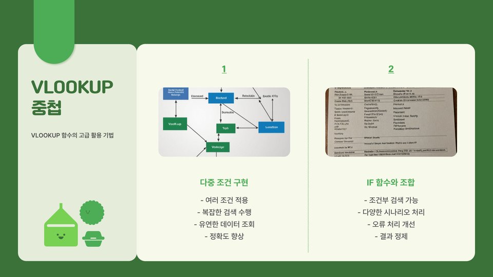 VLOOKUP 함수는 주어진 값(lookup_value)을 기준으로 특정 범위(table_array)에서 해당 값을 찾고, 그에 대응하는 값을 반환하는 함수입니다. 기본 구문은 VLOOKUP(lookup_value, table_array, col_index_num, [range_lookup])입니다. 여기서 lookup_value는 찾고자 하는 값, table_array는 검색할 데이터 범위, col_index_num은 반환할 열 번호, 마지막으로 range_lookup은 근사값을 사용할 것인지 결정하는 매개변수입니다. 이 기본 개념을 이해하는 것이 중요합니다.