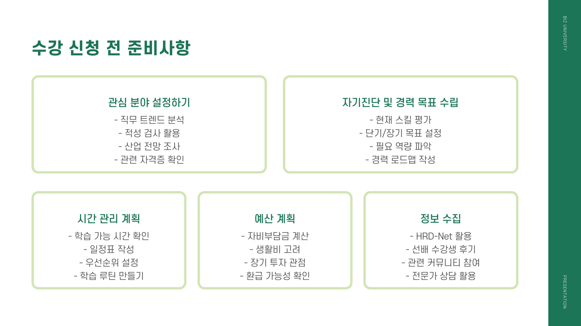 - 관심 분야 파악하기: 자신이 어떤 분야에 관심이 있는지 미리 정리해두면, 수강 신청이 수월해집니다.