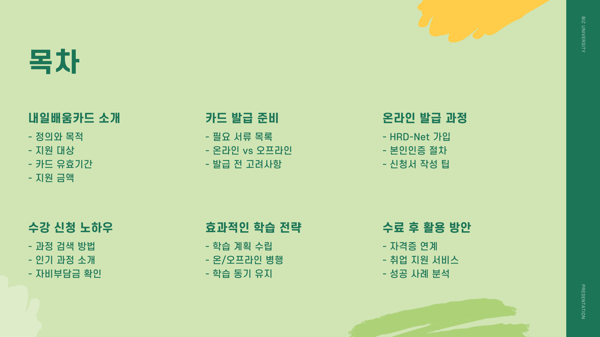 내일배움카드 수강 신청은 여러분의 경력 개발에 큰 도움이 될 수 있습니다. 신청 절차를 잘 이해하고, 유의사항과 꿀팁을 잘 활용한다면 더욱 효과적으로 원하는 교육을 받을 수 있을 것입니다. 이 기회를 통해 여러분의 꿈과 목표를 실현하는 데 한 걸음 더 나아가시길 바랍니다.