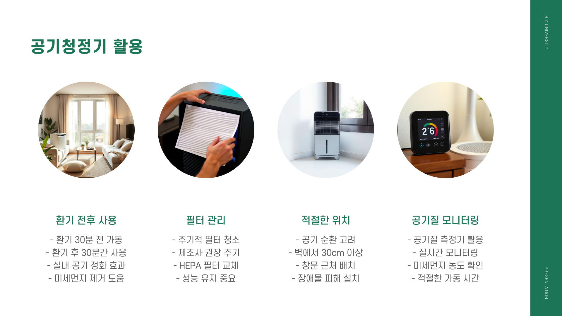 - 전략적으로 환기 시간을 정하여 실내 공기를 신선하게 유지하세요.