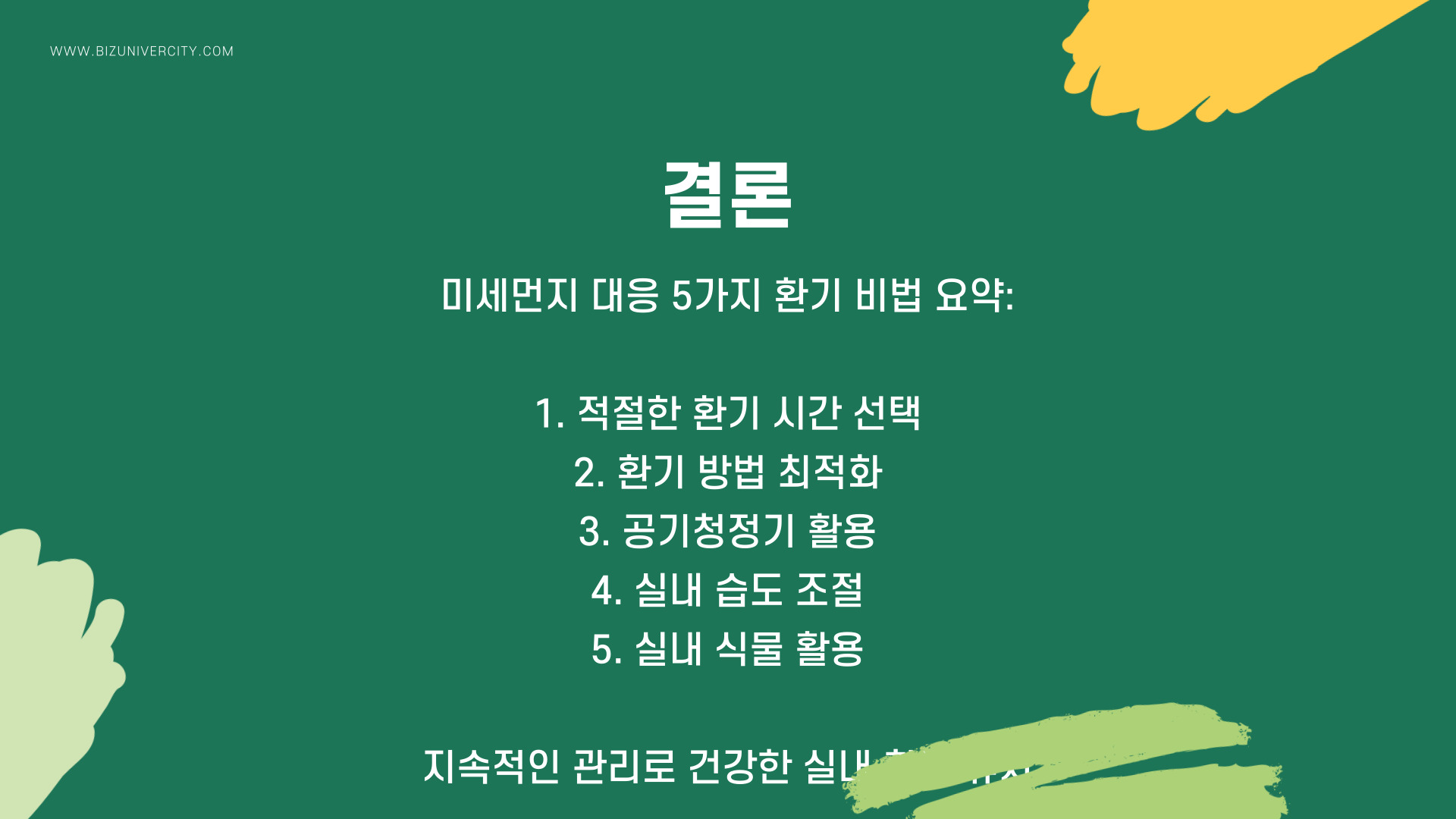 위의 다섯 가지 비법을 통해 미세먼지 심한 날에도 안전하고 효과적으로 환기를 관리할 수 있습니다. 미세먼지로부터 건강을 지키기 위해 꾸준한 관리가 필요합니다.