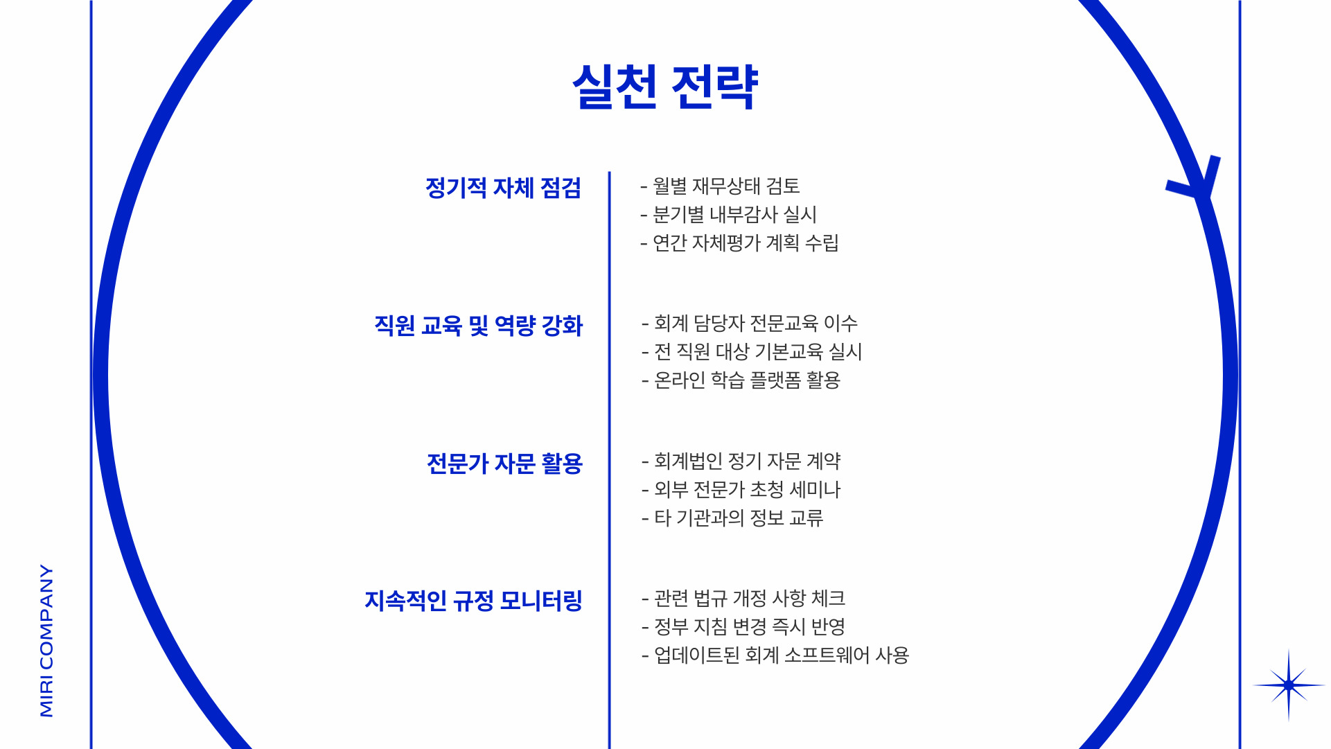 재무회계 규칙을 준수하기 위해서는 효과적인 관리 방안이 필요합니다. 첫 번째로, 정기적인 교육과 훈련이 절대적으로 필요합니다. 관련 직원들은 새로운 규칙이나 변경 사항에 대해 지속적으로 업데이트되어야 하며, 이를 통해 회계 시스템이 효율적으로 운영될 수 있습니다. 기업 내 회계 및 재무 관리에 관한 정기 교육을 통해 기업의 회계 지식 수준을 높여야 합니다.