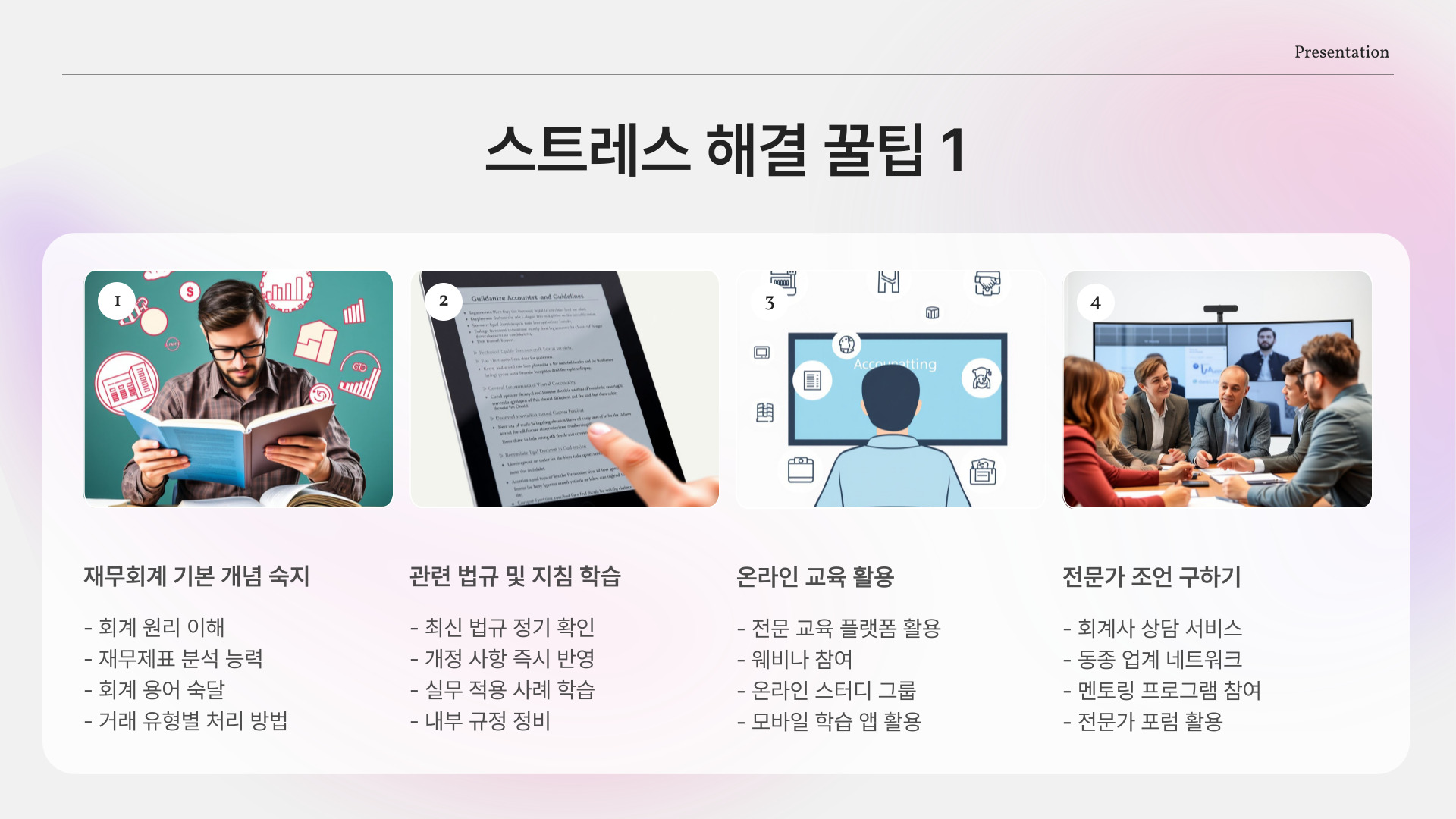재무회계 규칙으로 인한 스트레스를 줄이기 위한 몇 가지 팁을 소개합니다. 첫 번째로, 정기적인 교육입니다. 회계 팀원들에게 정기적으로 교육을 제공하여 새로운 규칙이나 변경 사항에 대한 이해도를 높이는 것이 중요합니다. 이를 통해 팀원들은 자신감을 가지고 업무를 수행할 수 있습니다.