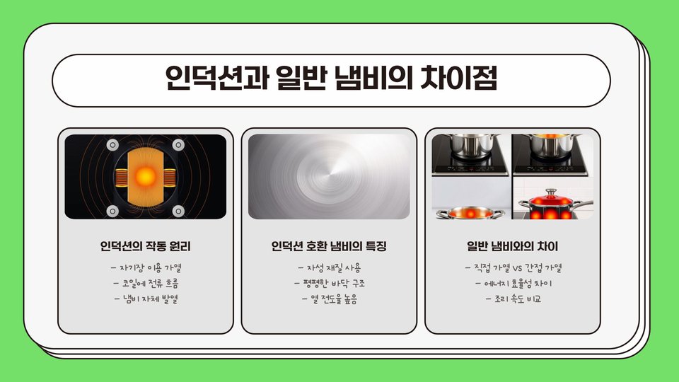 - 인덕션 조리기의 원리를 이해하고, 적절한 냄비를 선택하는 것이 중요합니다.