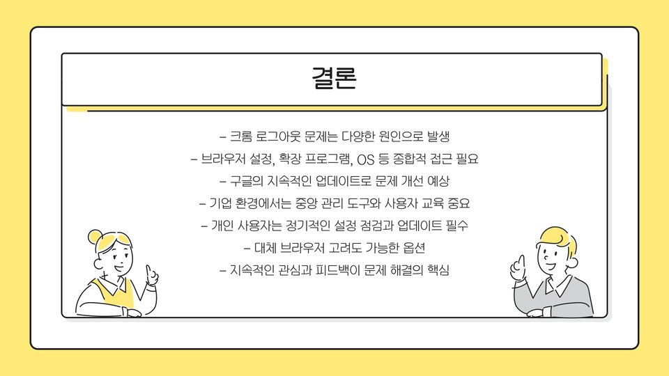 크롬에서 로그아웃이 풀리는 문제는 여러 원인에 의해 발생할 수 있지만, 위에서 소개한 방법들을 통해 쉽게 해결할 수 있습니다. 쿠키 삭제, 확장 프로그램 비활성화, 브라우저 업데이트 등 다양한 방법을 통해 사용자들은 이 문제를 해결할 수 있습니다. 또한 예방 조치를 통해 이러한 문제가 다시 발생하지 않도록 주의하는 것이 중요합니다.