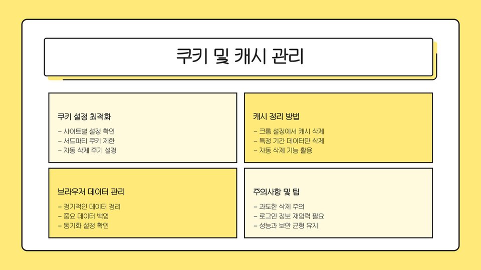 | 정기적인 쿠키 및 캐시 삭제 | 브라우저 성능 최적화 |
