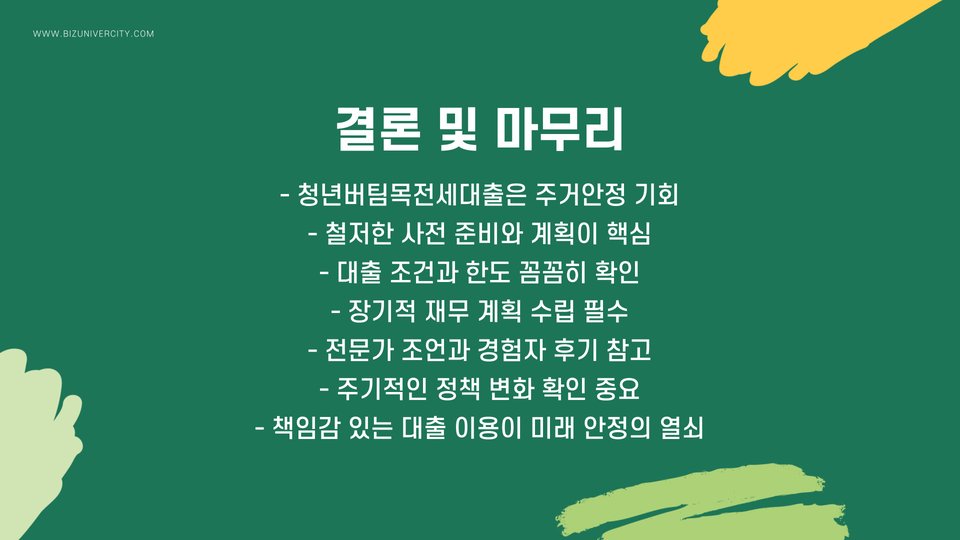 결론적으로, 청년버팀목전세대출은 청년들에게 주거안정을 위한 훌륭한 선택지입니다. 긍정적인 후기를 기반으로 한 다양한 경험을 참고하여, 자신의 상황에 맞는 최적의 선택을 하는 것이 중요하겠습니다.