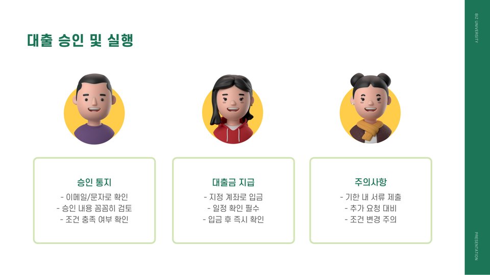 이후에는 상담 후 대출 신청을 진행하며, 이후 대출 심사가 진행됩니다. 심사 기간은 일반적으로 1주일 이내로 진행되며, 이는 기관마다 차이가 있을 수 있습니다. 심사 통과 후에는 대출 실행이 이루어지며, 이 때 대출 금액이 고객의 계좌로 송금됩니다.
